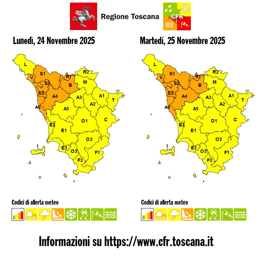Allerta meteo in Toscana: allerta arancione per rischio idrogeologico nel nord-ovest dalle 17 di oggi fino alle 9 di domani, martedì 25 novembre. Allerta gialla sul resto della regione.
