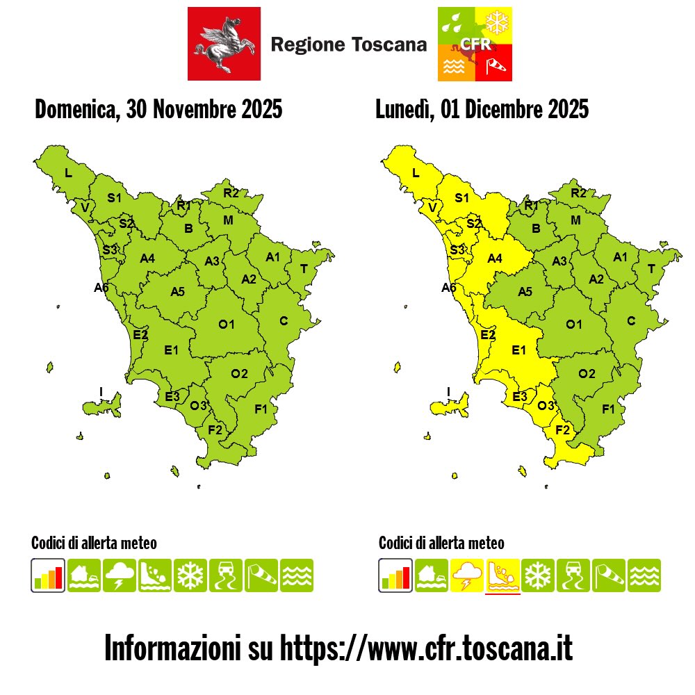 La Sala operativa della Protezione civile regionale ha emesso un codice giallo per pioggia e temporali nella giornata di domani, lunedì 1° dicembre, sull’intera fascia costiera della Toscana con interessamento delle isole dell’Arcipelago e sulle aree interne del Serchio, della Garfagnana e del Valdarno Inferiore.