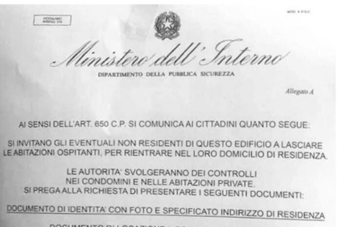I volantini, recanti l’intestazione “Ministero dell’Interno – Dipartimento della Pubblica Sicurezza”, invitano i non residenti a lasciare le abitazioni e minacciano sanzioni fino a 206 euro o addirittura pene detentive in casi gravi. Nel testo si richiedono documenti come carta d’identità, contratti di locazione o certificazioni mediche, indicando come giustificabili solo motivi di salute, assistenza agli anziani o lavoro.