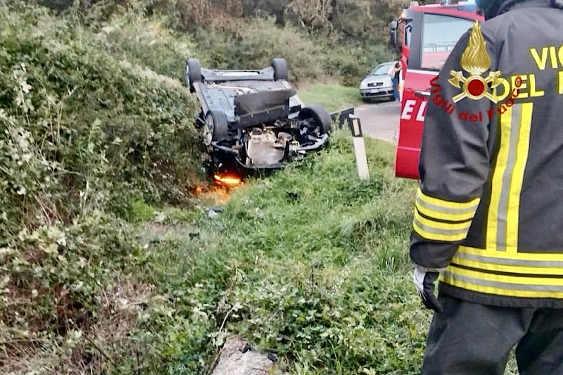 Auto ribaltata, conducente illeso. Vigili del Fuoco e 118 sul posto per soccorsi e messa in sicurezza.