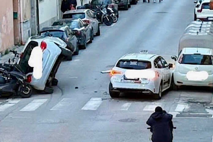 Nella scena si vede un’auto ribaltata, nei pressi delle strisce pedonali, sopra alcuni motorini e un altro veicolo, probabilmente un taxi, finito contro un’auto parcheggiata.