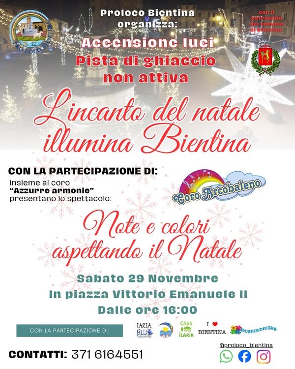 «Il Natale – continua Cai – inizia oggi, 29 novembre, e proseguirà fino alla Befana. Vogliamo portare tanta gente a Bientina, sia per divertirsi sulla pista sia per godersi le luci che decorano ogni angolo del paese. Senza dimenticare, aspetto importante, i nostri negozi, che resteranno aperti per tutto dicembre e che vi aspettano per gli acquisti natalizi. Bientina è pronta ad accogliervi.»
