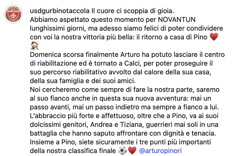 Il giovane calciatore Arturo Pinori, conosciuto da tutti come “Pino”, è tornato a casa domenica scorsa, lasciando il centro di riabilitazione per proseguire il suo percorso di recupero tra l’affetto della famiglia e degli amici.
