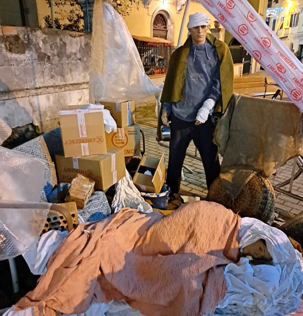 Infatti, nel presepe in questione non ci sono muschi o sassolini, ma macerie e oggetti quotidiani resi simboli di precarietà e distruzione: cenere, rimanenze di case distrutte, un lavandino, un pupazzo di cane ricoperto di cenere, pentole ammaccate, un tavolino di scuola arrugginito e una bicicletta inservibile. «Queste cose rappresentano la ‘non casa’ di chi oggi vive in queste condizioni», spiega l’artista.