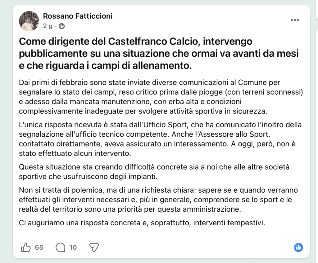 La situazione starebbe creando disagi non solo al Castelfranco Calcio, ma anche alle altre società sportive che utilizzano le strutture. “Non si tratta di polemica – precisa il dirigente – ma di una richiesta chiara”, ovvero conoscere tempi e modalità degli eventuali interventi.