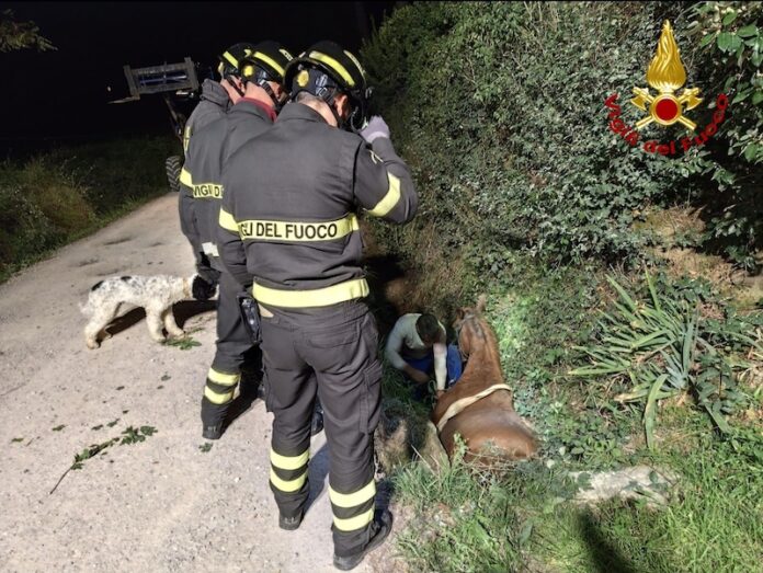 Un cavallo era infatti caduto in un fossato profondo circa due metri, rimanendo intrappolato e impossibilitato a risalire autonomamente. I pompieri, giunti tempestivamente sul posto, hanno provveduto a imbracare con cura l’equino e, grazie all’ausilio di un mezzo agricolo reperito in loco, sono riusciti a sollevarlo e riportarlo sul piano strada.fossato
