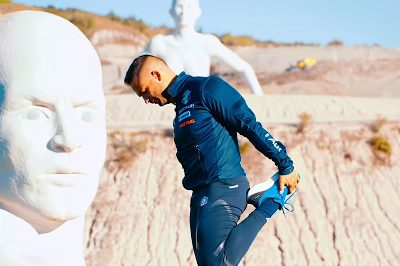 Fantazzini si è messo alla prova tra le opere monumentali del parco: salti sopra le sculture dei giganti Presenze, scatti in salita verso i giganteschi mammut preistorici ed esercizi mirati alla potenza muscolare. Un contesto unico, che unisce sport, arte contemporanea e paesaggio, diventato per l’atleta un vero laboratorio di preparazione fisica.