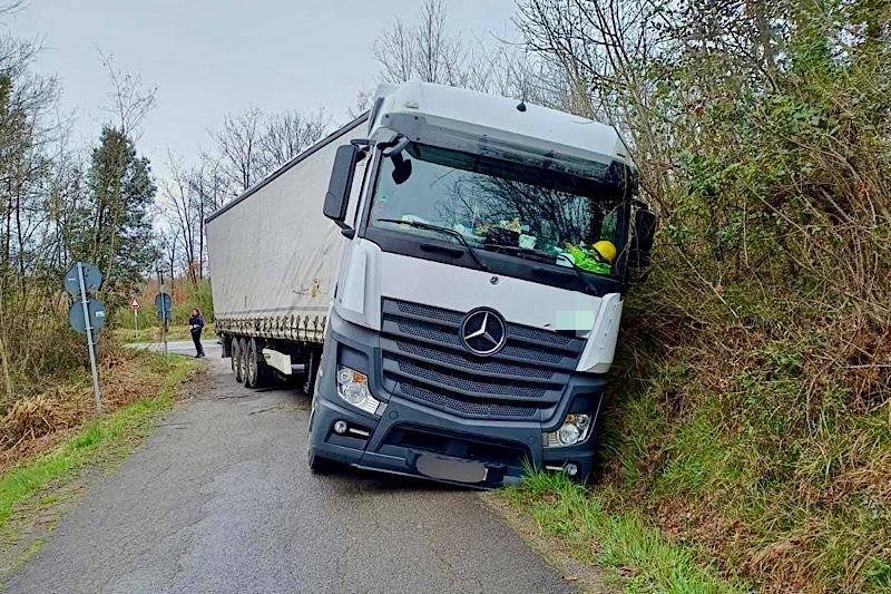 Camion fuori strada a Fucecchio: via di Rimedio chiusa vicino all’incrocio con via Pesciatina. Viabilità limitata per i residenti e traffico deviato.