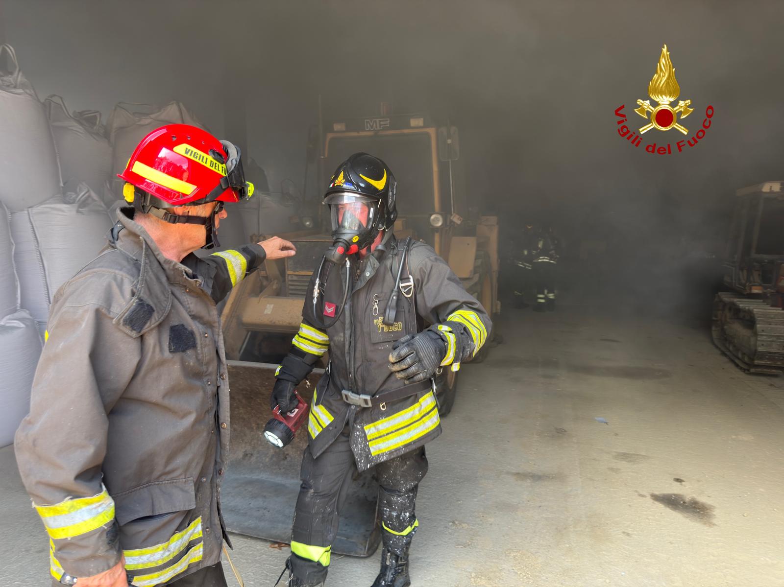 Le fiamme hanno colpito in particolare una macchina agricola parcheggiata nella struttura. All’interno del capannone erano presenti anche sacchi di concime chimico e bombole di ossiacetilene, materiali che hanno reso più complesso e delicato l’intervento di spegnimento, a causa del rischio di esplosioni e della possibile dispersione di sostanze pericolose.