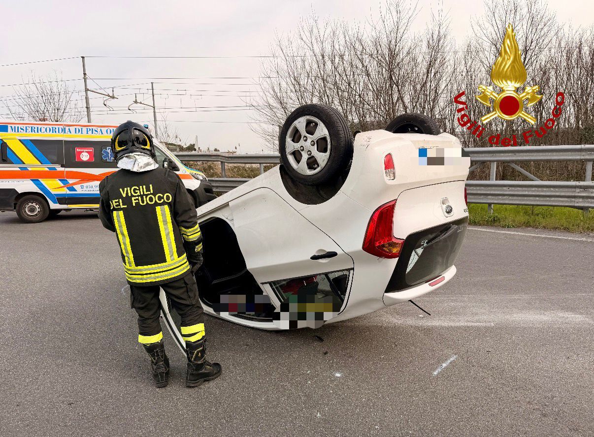 Incidente stradale a Pisa in Via Aurelia Sud: auto si ribalta e un ferito viene soccorso. Sul posto Vigili del Fuoco e Polizia Municipale.
