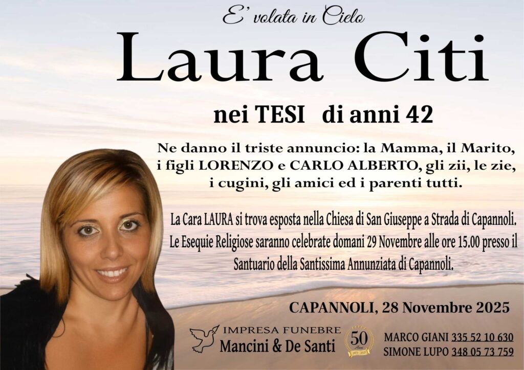 CAPANNOLI – Capannoli è in lutto per la scomparsa prematura di Laura Citi, 42 anni, giovane madre di due figli, deceduta a causa di una malattia. Laura lascia i figli Lorenzo e Carlo Alberto e il marito, che in queste ore ricevono il sostegno e l’affetto di parenti, amici e dell’intera comunità.