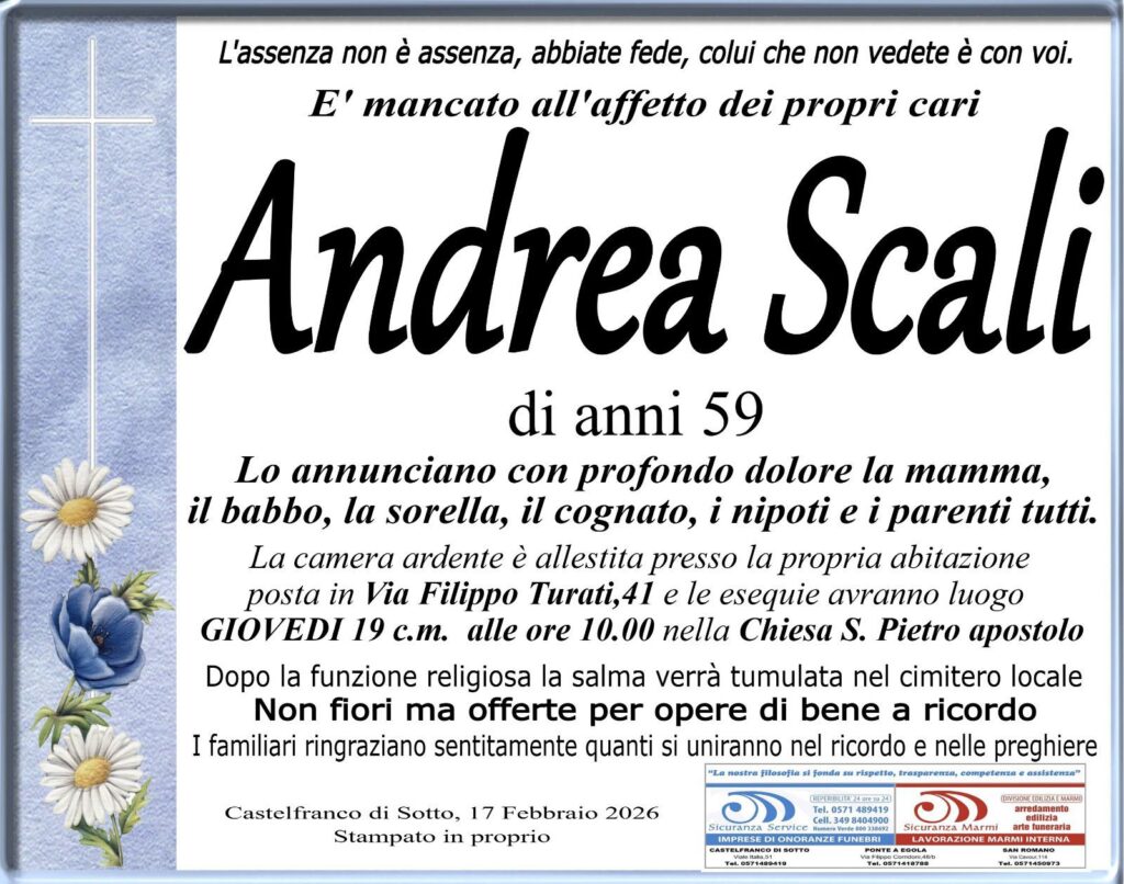 La notizia della sua scomparsa ha profondamente colpito la comunità di Castelfranco di Sotto, dove Andrea era conosciuto e stimato. A darne il doloroso annuncio sono la mamma, il babbo, la sorella, il cognato, i nipoti e tutti i parenti, uniti in questo momento di immenso dolore.