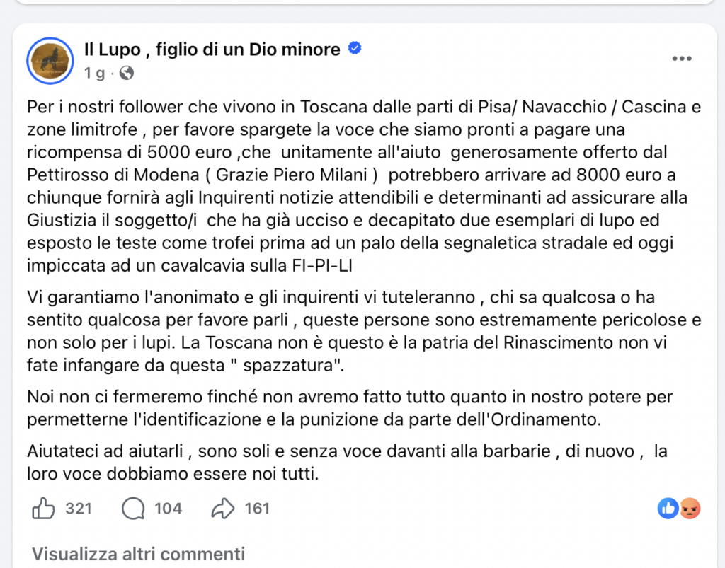 Un grave episodio di violenza contro la fauna selvatica scuote la Toscana e in particolare l’area tra Pisa, Navacchio e Cascina. Due esemplari di lupo sono stati uccisi, decapitati e le loro teste esposte pubblicamente: prima su un palo della segnaletica stradale (Clicca qui), poi appese a un cavalcavia lungo la FI-PI-LI (Clicca qui), in un gesto che ha suscitato indignazione e allarme.