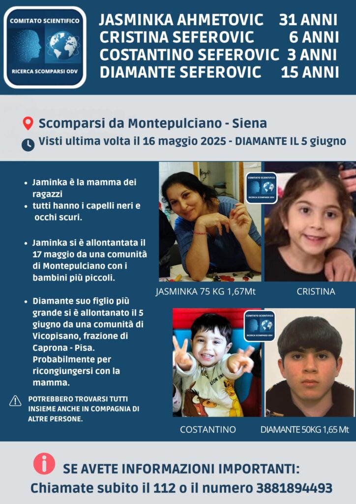 Cresce l’apprensione per la scomparsa di Jasminka Ahmetovic, 31 anni, e dei suoi tre figli: Cristina Seferovic, 6 anni, Costantino Seferovic, 3 anni, e Diamante Seferovic, 15 anni. L’intera famiglia risulta irreperibile da diverse settimane e le autorità hanno attivato le ricerche su tutto il territorio nazionale.