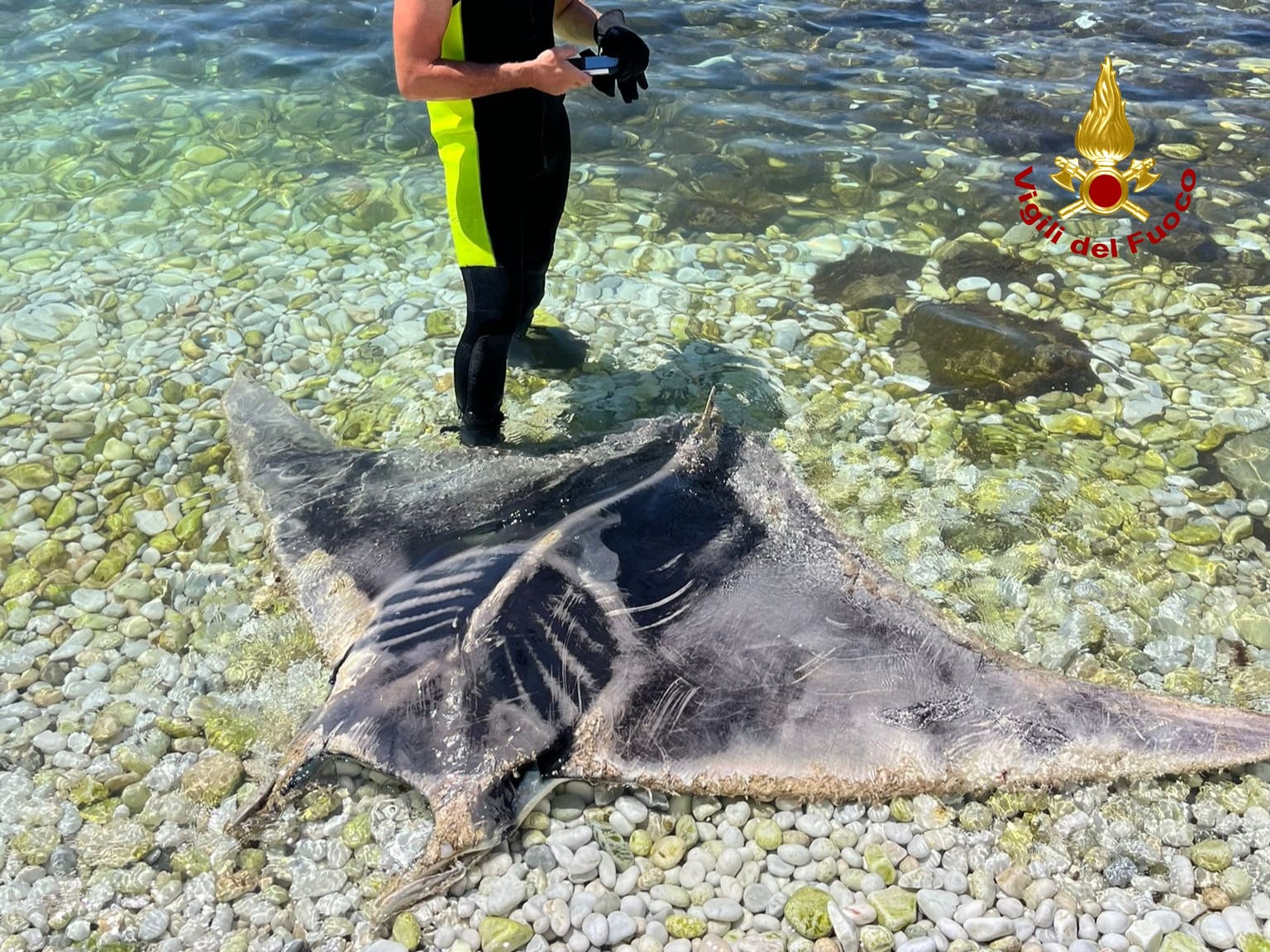 Intervento insolito a Marina di Pisa, dove una squadra dei Vigili del Fuoco della Vigilanza estiva, specializzata in soccorso acquatico, è intervenuta per il recupero di una Mobula, un grande pesce appartenente alla famiglia delle Myliobatidae, simile alla manta. E’ accaduto intorno alle 11:40 sulla spiaggia di ghiaia in prossimità di Via Robertino Francaldi.