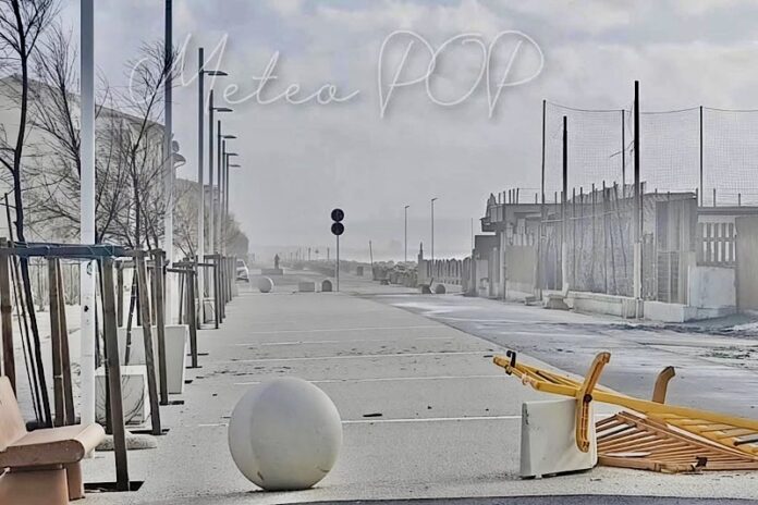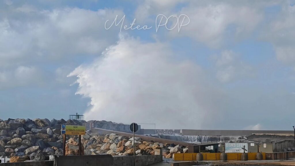 Le immagini diffuse da METEO POP, realizzate direttamente dal lungomare, mostrano un mare molto agitato e spruzzi che superano le barriere costiere, rendendo evidente la criticità della situazione.