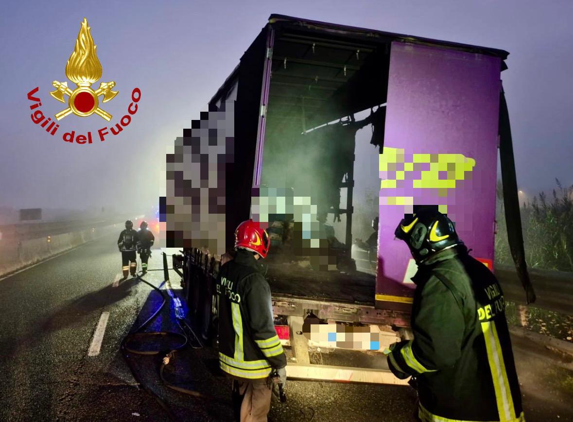 Il conducente del tir, si è accorto dell’incendio di un pneumatico del rimorichio, riuscendo a fermare il mezzo al margine della corsia.
