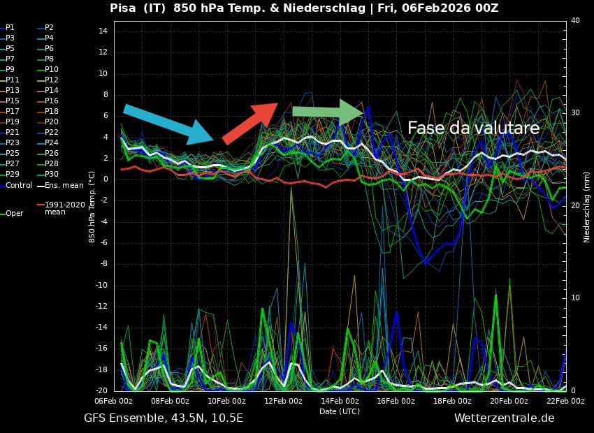 Secondo l’analisi di Meteo POP (Rete Meteo Amatori) per VTrend, nel breve periodo non ci sono elementi concreti per un ritorno della neve a bassa quota in Toscana. I principali modelli previsionali ed ensemble mostrano una prima fase caratterizzata da temperature sopra la media stagionale, con valori a 850 hPa generalmente positivi e condizioni nel complesso stabili o poco perturbate.