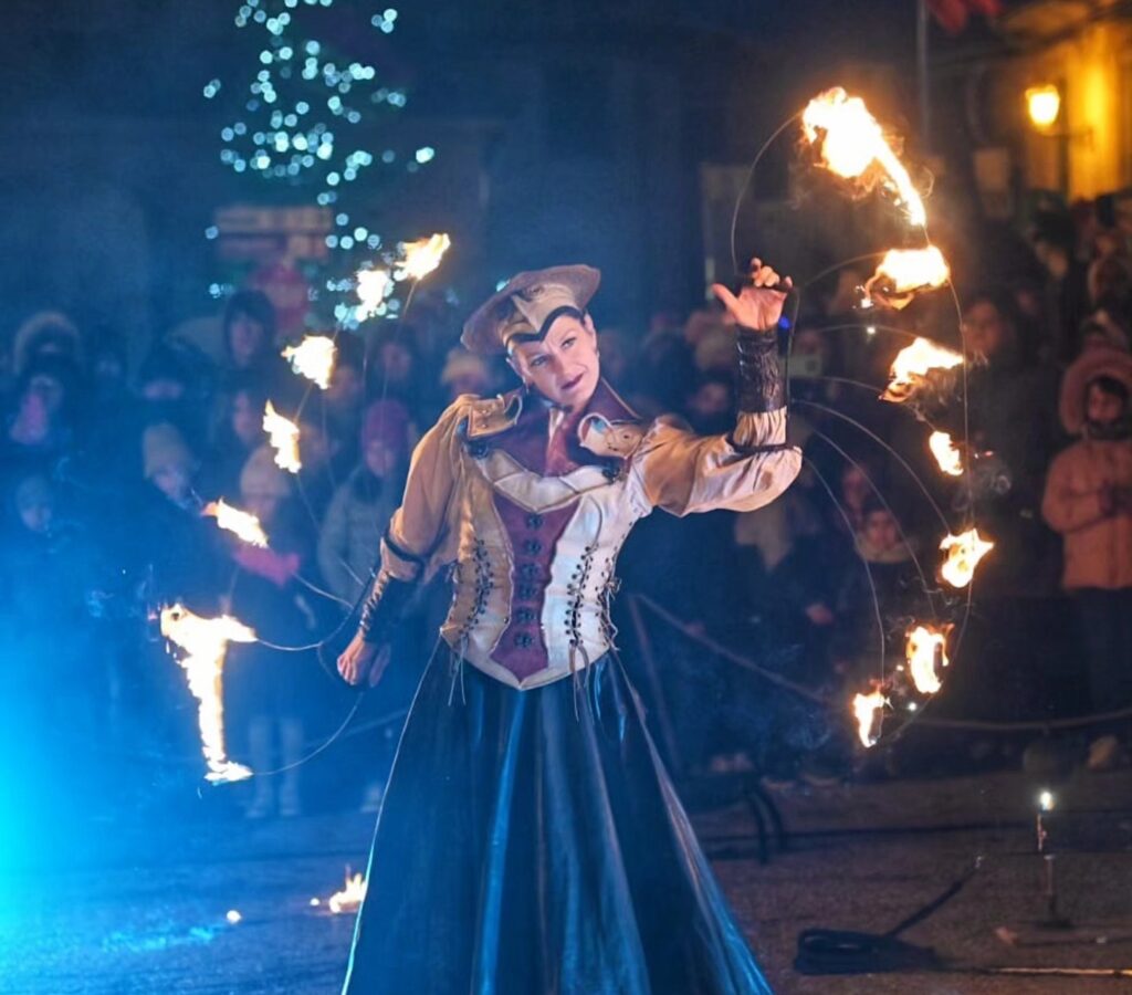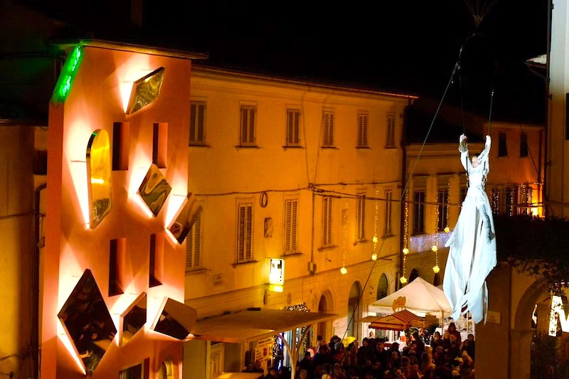 Il centro storico ha ospitato spettacoli itineranti e performance di grande suggestione, tra cui l’energia travolgente della prima orchestra itinerante di archi ArchiMossi, l’eleganza scenica di Madame Opera, il circo musicale di Nando e Maila con Sonata per Tubi, la poesia luminosa de La Grande Dama del Cardinali Group, le atmosfere rituali di Orakel di Opera Fiammae e l’imponente spettacolo aereo Luna Bianca della Compagnia dei Folli, che ha incantato il pubblico con una scenografia sospesa tra sogno e realtà.
