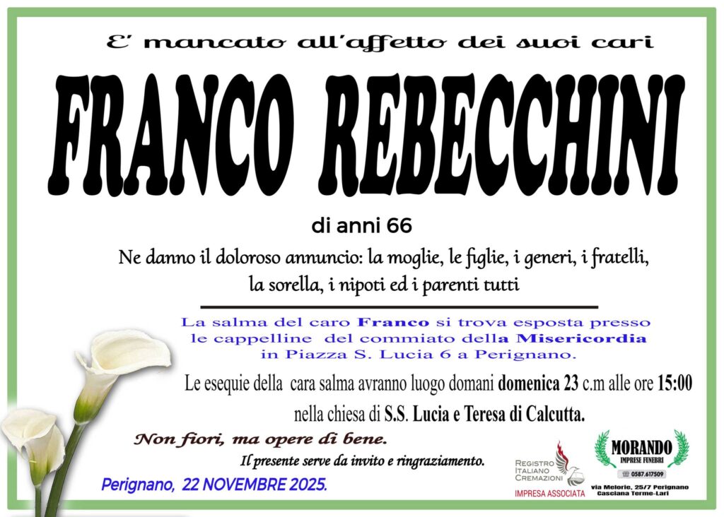 La comunità di Casciana Terme Lari piange la scomparsa di Franco Rebecchini, venuto a mancare all’età di 66 anni. Ne danno il doloroso annuncio la moglie, le figlie, i generi, i fratelli, la sorella, i nipoti e tutti i parenti.