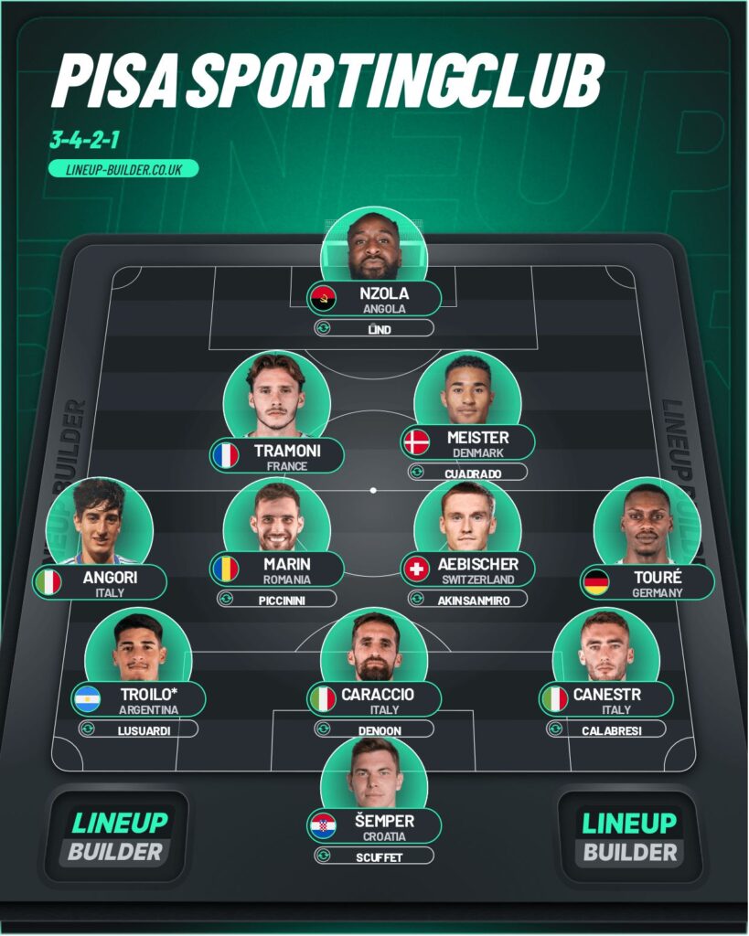 PISA (3-4-2-1): Šemper (Scuffet); Canestrelli (Calabresi), Caracciolo (Denoon), Troilo (Lusuardi); Touré, Aebischer (Akinsamiro), Marin (Piccinini), Angori; Meister (Cuadrado), Tramoni; Nzola (Lind).