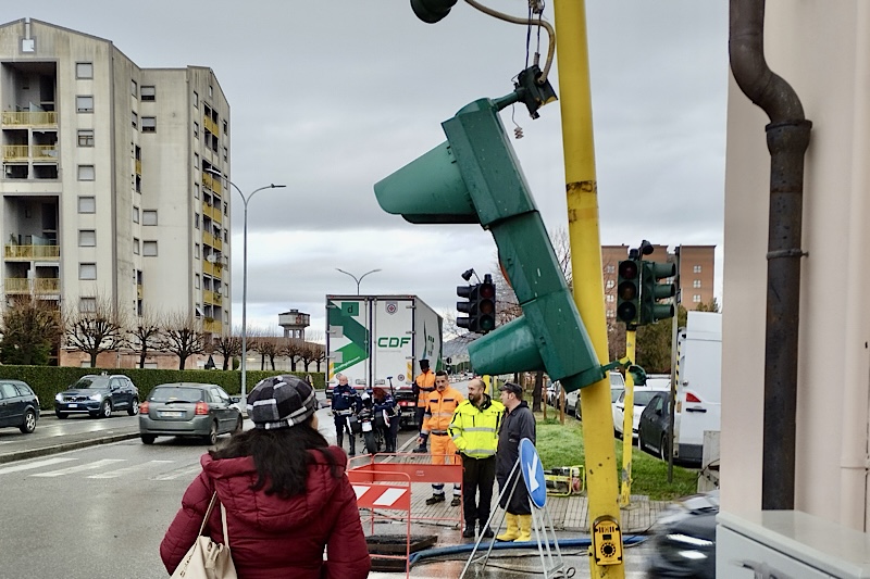 L’incrocio è rimasto chiuso al traffico fino a mercoledì 11, con ripristino dell’impianto e dell’incrocio da giovedì 12 febbraio. Nella giornata di sabato 14 febbraio, durante l’esecuzione di lavori da parte di una ditta privata, si è verificato un nuovo guasto che ha messo fuori servizio il regolatore del semaforico.