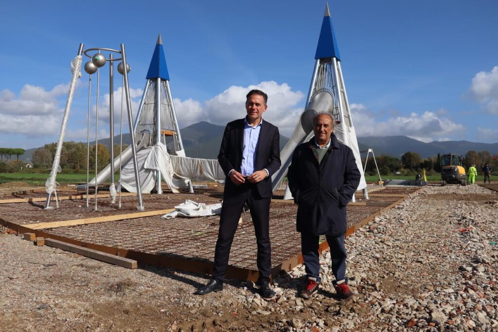 Sopralluogo del sindaco di Pisa Michele Conti, insieme al dirigente per i progetti PNRR del Comune, progettista e direttore dei lavori, Fabio Daole, al cantiere del parco di via Pungilupo, la grande area a verde di 11mila metri quadrati che sta sorgendo a Cisanello grazie al finanziamento ottenuto con fondi PNRR all’interno del progetto PINQUA “Pisa This” per 4,5 milioni di euro.
