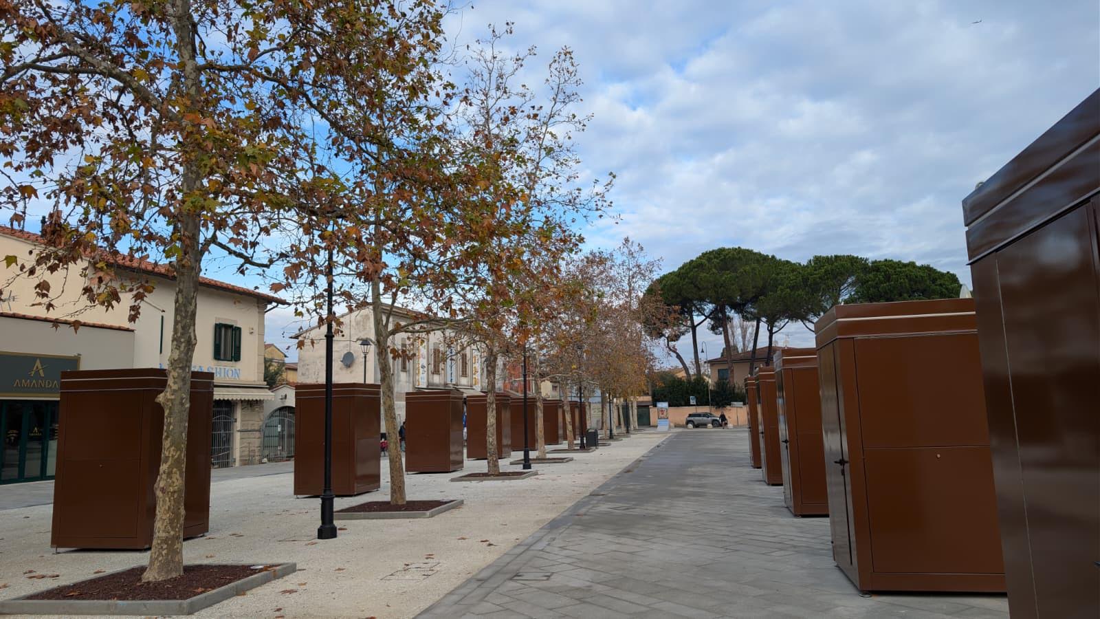 Ai lati del camminamento si collocano i nuovi arredi per il commercio disposti a distanza di circa 6,5 metri l’uno dall’altro, secondo il progetto approvato dalla Soprintendenza di Pisa: box completamente apribile, realizzato con finitura esterna tipo corten, rinnovato completamente nell’immagine che saranno posizionati, alternati ai filari di alberature. Tra Piazza Manin e Largo Cocco Griffi trovano collocazione anche un chiosco per informazioni turistiche. La realizzazione dei nuovi banchi commerciali è stata oggetto di finanziamento ulteriore, che non rientra all’interno del progetto Pinqua. L’Amministrazione Comunale ha infatti concluso, con procedura di accordo quadro del valore complessivo di 3 milioni, la fornitura e posa in opera dei nuovi banchi commerciali, che vengono installati secondo un cronoprogramma che segue a stati di avanzamento le diverse fasi di esecuzione dei lavori. La collocazione dei banchi commerciali è quella prevista dal nuovo Piano del Commercio su aree pubbliche, approvato dal Consiglio Comunale 2022. Le bancarelle saranno dislocate nelle seguenti aree: via Contessa Matilde, Largo Cocco Griffi, Piazzetta c. Salomone, Piazza Manin, parcheggio pubblico su via Cammeo, via Cardinale Maffi, oltre al parcheggio scambiatore di via Pietrasantina.
