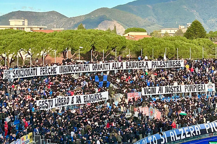 Oggi, in occasione della partita Pisa-Sassuolo all’Arena Garibaldi, la Curva Nord “Maurizio Alberti” ha voluto mostrare vicinanza ai Vigili del Fuoco esponendo uno striscione con la scritta: “Sanzionati perché inginocchiati davanti alla bandiera palestinese. Gesto libero e da elogiare… Vicini ai nostri pompieri”.