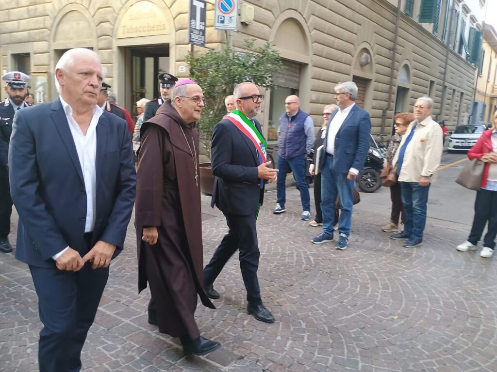 Pontedera celebra San Faustino con istituzioni, comunità e il dono simbolico della Vespa all’Arcivescovo come messaggio di pace e unità.