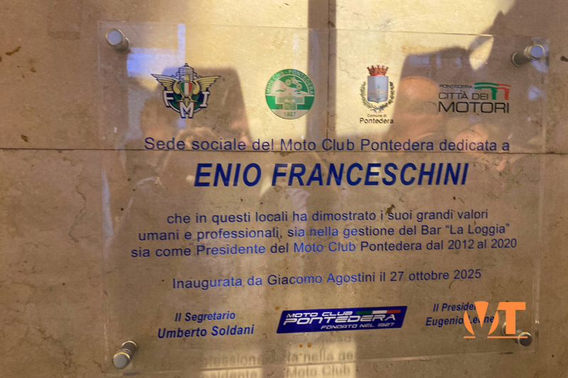 PONTEDERA – La sede del Moto Club Pontedera in viale Italia è ora ufficialmente dedicata a Enio Franceschini, storico presidente del club scomparso prematuramente alla fine di agosto. A svelare la targa commemorativa è stato Giacomo Agostini, leggenda del motociclismo e campione più vincente della storia delle due ruote.