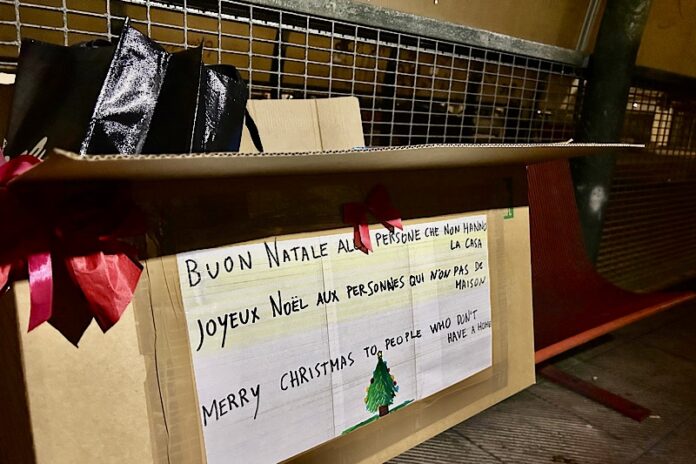 All’esterno della scatola, un cartello scritto in tre lingue – italiano, francese e inglese – recitava: “Buon Natale alle persone che non hanno una casa”. Un gesto pensato per raggiungere tutti, senza barriere linguistiche, e per ricordare che la solidarietà non ha confini.