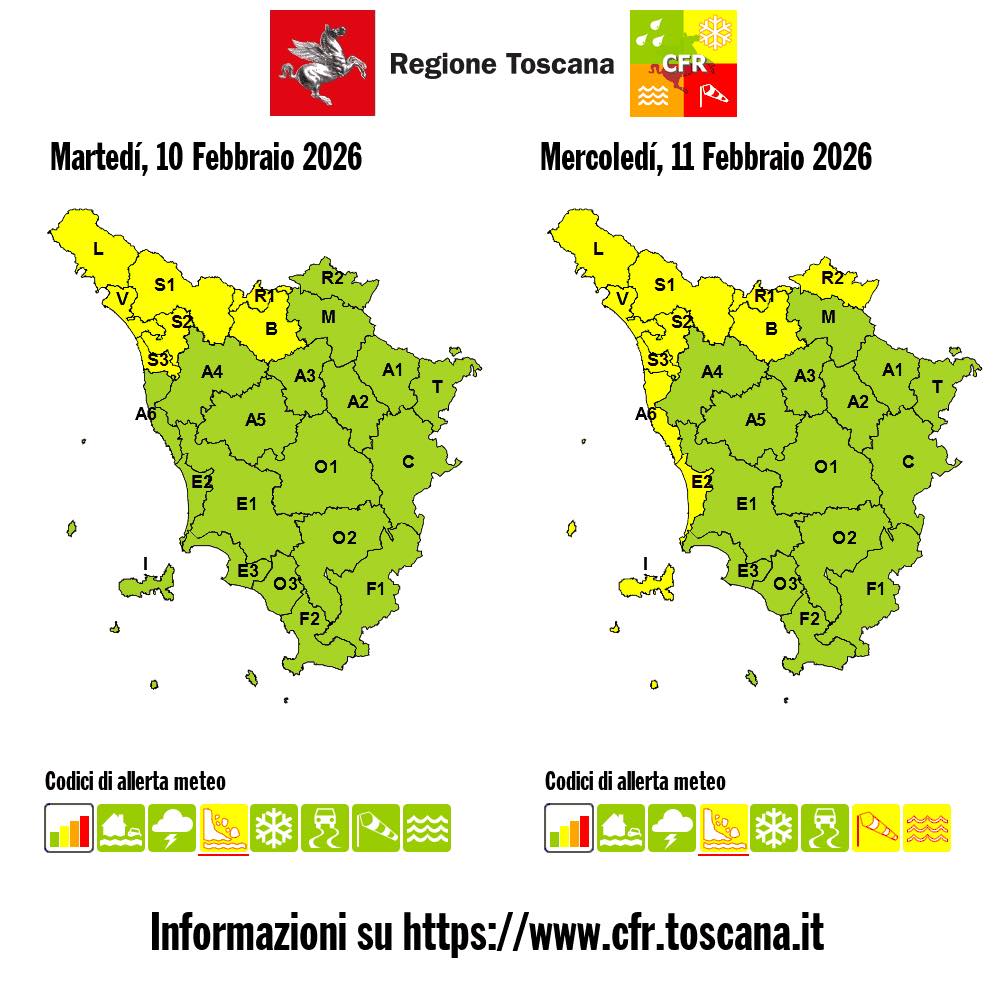 La Sala Operativa della Protezione Civile della Toscana ha emesso un avviso di allerta gialla per rischio idrogeologico, vento forte e mareggiate, valido su diverse zone della regione tra oggi e domani, mercoledì 11 febbraio.