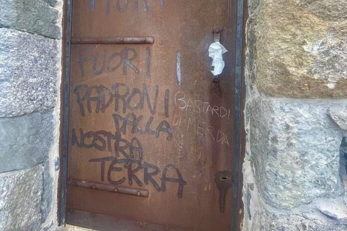 Ignoti hanno tentato di forzare e manomettere la serratura, introducendo materiali all’interno del meccanismo per impedirne l’utilizzo; la maniglia è stata imbrattata con sostanze organiche (escrementi) e la porta deturpata con scritte offensive e volgari: “Suca” e “Bastardi di merda”.