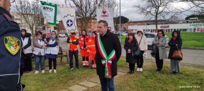 Questa mattina a distanza di 3 anni dalla fine della pandemia, in occasione della giornata nazionale delle vittime del Covid 19, il sindaco Roberto Giannoni, gli assessori, i consiglieri comunali, le altre autorità e le associazioni di volontariato si sono ritrovati in via Brunelleschi, in una cerimonia per deporre al monumento in memoria delle 42 vittime una corona di alloro.