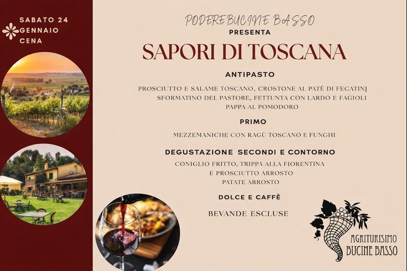 La magia prende forma VENERDÌ 24 GENNAIO, quando il Podere apre le sue porte a una serata speciale: “Sapori di Toscana”. Un menù pensato per esaltare la nostra terra, che accompagna gli ospiti dagli antipasti al primo, dai secondi con contorni fino al dolce finale, in un percorso di gusto autentico e generoso.