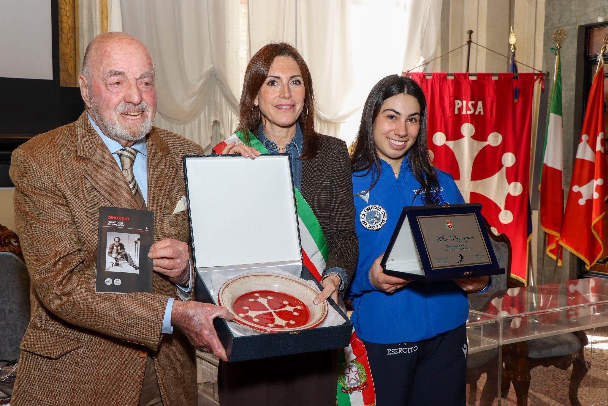 A premiare i due protagonisti è stata l’assessore allo sport del Comune di Pisa, Frida Scarpa. A Franco Cambi è stato donato un bacino ceramico decorato con l’effige della croce pisana, simbolo del legame indissolubile tra la storia della sua famiglia e l’identità cittadina. Ad Alice Pazzaglia è stata invece conferita una targa celebrativa con l’incisione: “Una pisana in vetta. Con orgoglio e riconoscenza”, a testimonianza dell’abbraccio della comunità ai successi della giovane atleta.