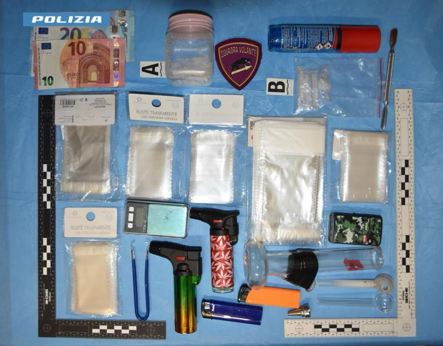 Sono state inoltre rinvenute quattro dosi pronte alla rivendita della stessa sostanza (peso complessivo di 2,2 gr.), oltre a un bilancino di precisione, molti involucri di cellophane utili per il confezionamento nonché altri strumenti atti al consumo ed al taglio della sostanza.
