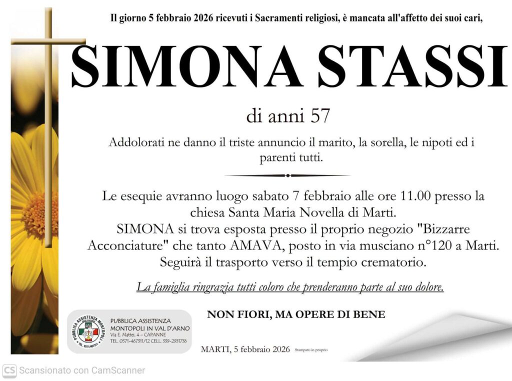 Con profondo dolore l’intera provincia di Pisa piange la scomparsa di Simona Stassi, di Pontedera, titolare del noto salone “Bizzarre Acconciature 3.0” a Marti (Montopoli in Val d’Arno).