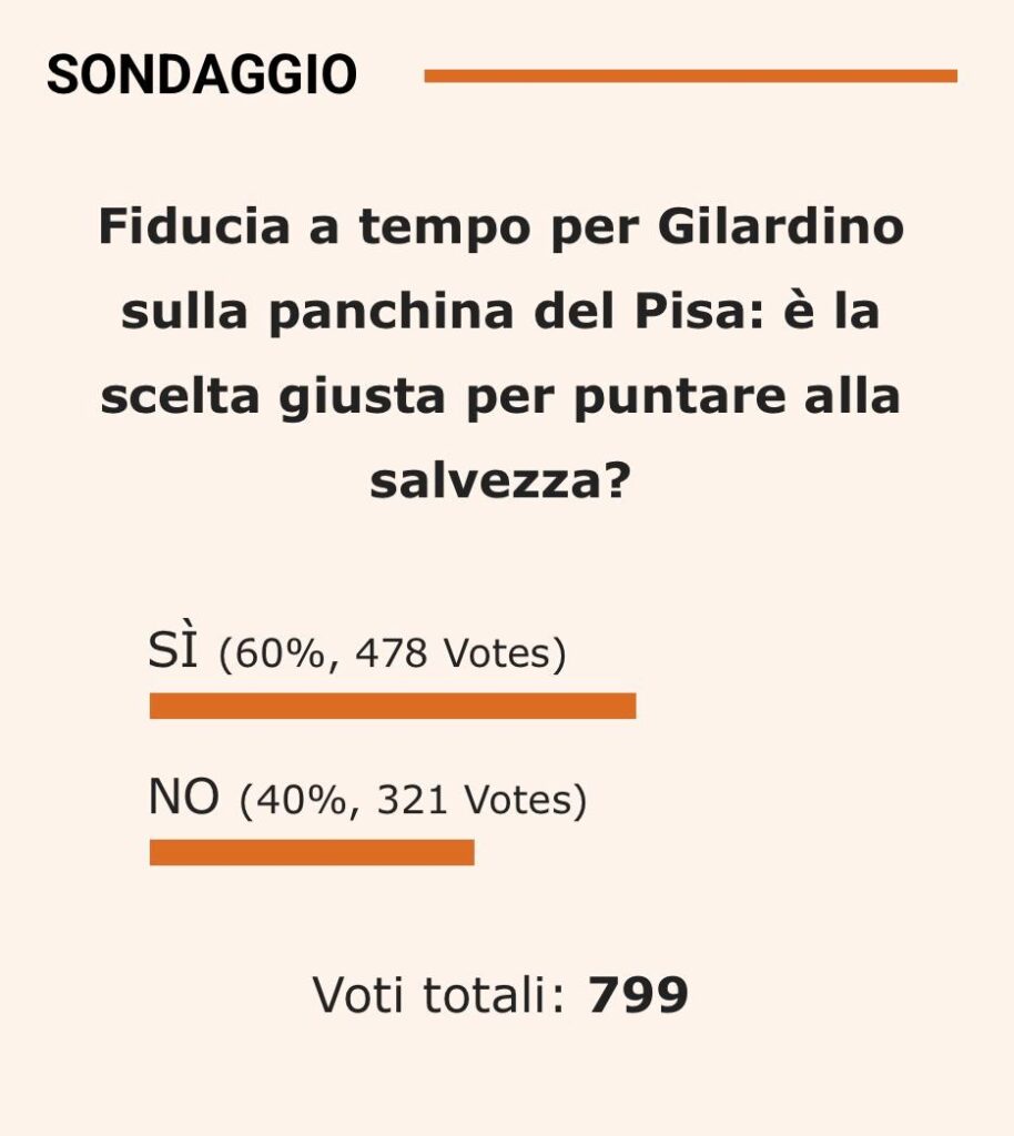 Si è chiuso da poco il sondaggio dedicato alla fiducia dei tifosi del Pisa sulla figura di Alberto Gilardino. Dopo il momento generale non positivo a livello di risultati, la piazza nerazzurra sembra guardare con un misto di speranza e prudenza al continuo della stagione.