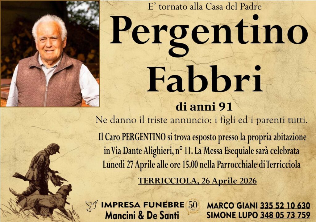 Un messaggio di cordoglio arriva anche dal Circolo ACLI Don Naldo Vallesi APS di Montescudaio, che ricorda con affetto il legame con la famiglia: “Nel pomeriggio del 25 aprile il babbo del nostro parroco don Marco Fabbri, signor Pergentino, è salito al Padre. La Messa esequiale sarà celebrata dal vescovo Roberto lunedì 27 aprile alle 15.00. Una preghiera per lui, per il nostro parroco don Marco e per la sua famiglia”.