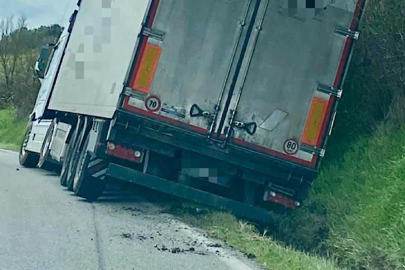 Incidente sulla SS439 a Montecatini Val di Cecina: autoarticolato fuori strada. Dinamica in fase di accertamento.