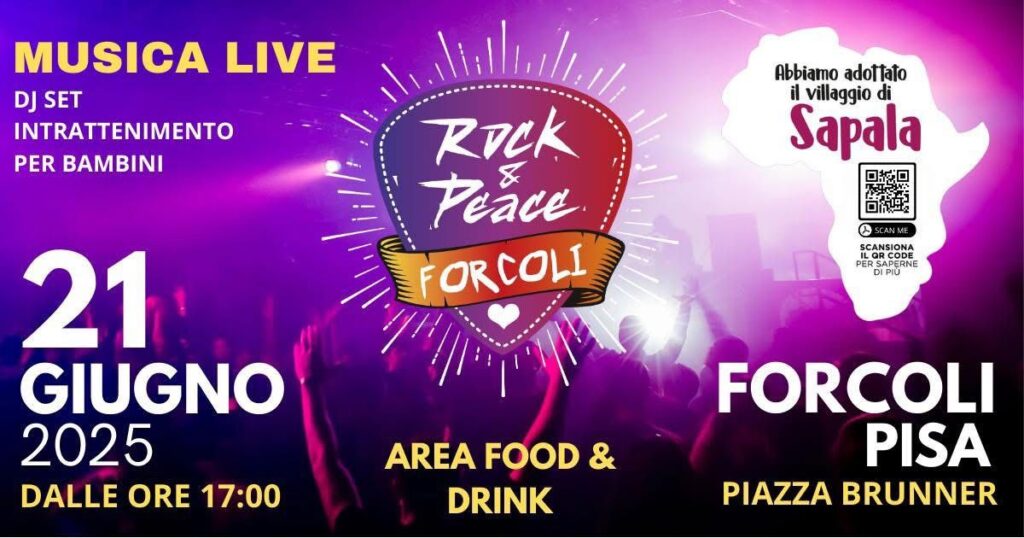 Il prossimo 21 giugno 2025, a partire dalle ore 17:00 in Piazza Brunner a Forcoli (Pisa), si svolgerà la quarta edizione dell’evento “Rock & Peace”, manifestazione che unisce musica dal vivo, intrattenimento e beneficenza.
