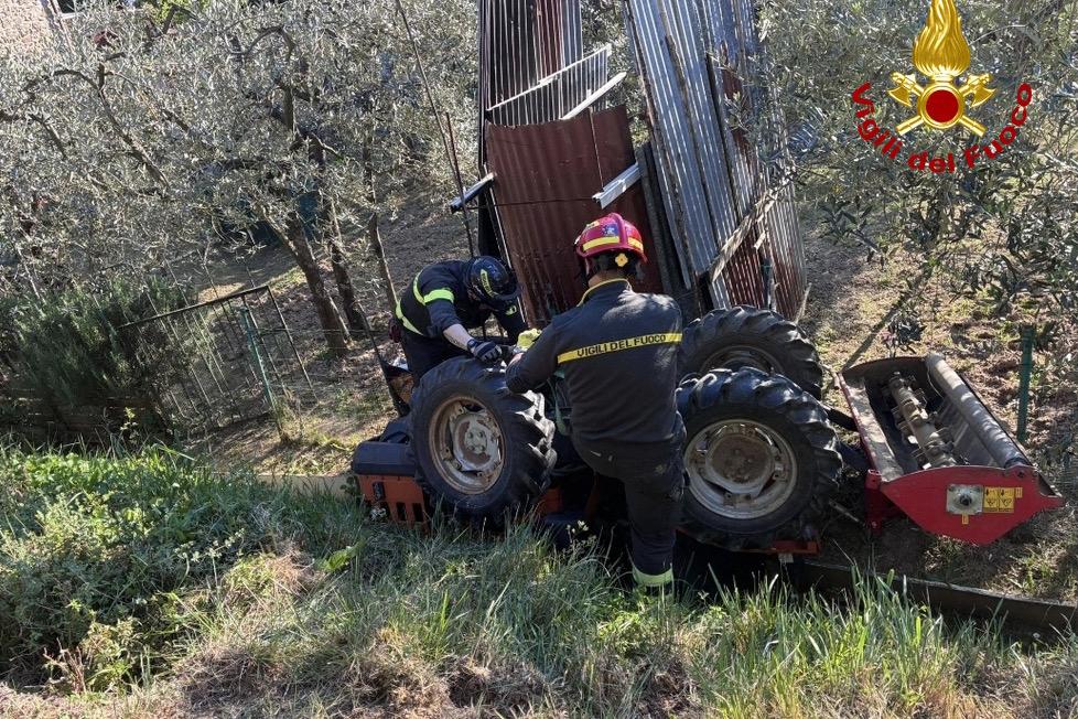 Un incidente agricolo ha visto coinvolto un uomo rimasto schiacciato sotto un trattore ribaltato. Provvidenziale l’intervento dei vigili del fuoco, che hanno liberato il conducente affidandolo poi alle cure del 118.