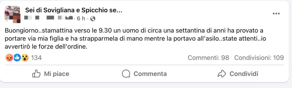 La donna ha raccontato che l’uomo avrebbe cercato di strappare la bambina dalle sue mani, ma fortunatamente è riuscita a impedirlo e a proteggere la figlia. “State attenti”, ha scritto nella segnalazione, annunciando di voler informare immediatamente le forze dell’ordine.