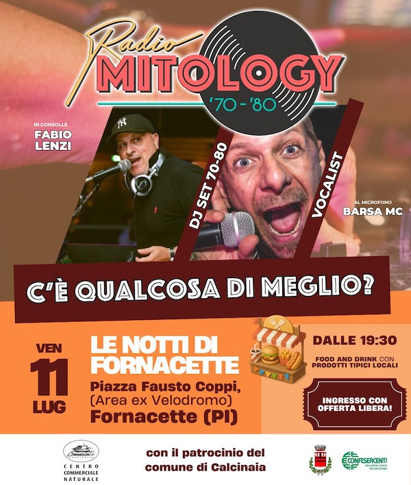 Piazza Fausto Coppi si trasformerà infatti in una vera e propria discoteca sotto le stelle con il DJ SET di RADIO MITOLOGY 70-80. Una serata “tutta da vivere tra musica, sapori locali e divertimento!”.