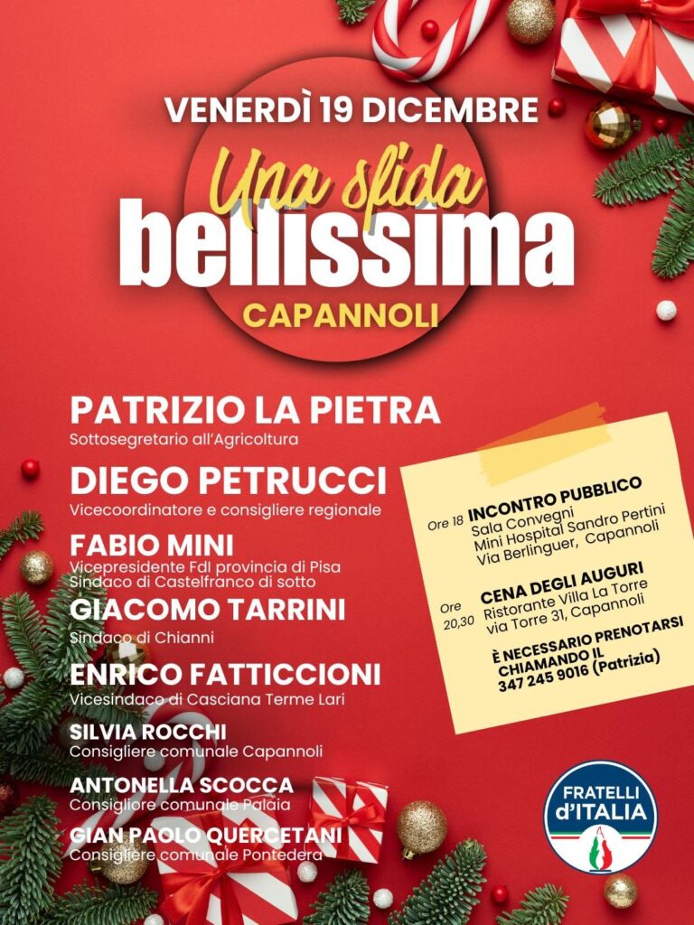 Capannoli si prepara ad accogliere una serata di confronto politico e di auguri in vista delle festività natalizie. Venerdì 19 dicembre è infatti in programma l’iniziativa dal titolo “Una sfida bellissima”, un appuntamento che unisce il dibattito pubblico ai momenti conviviali, coinvolgendo amministratori locali e rappresentanti delle istituzioni.