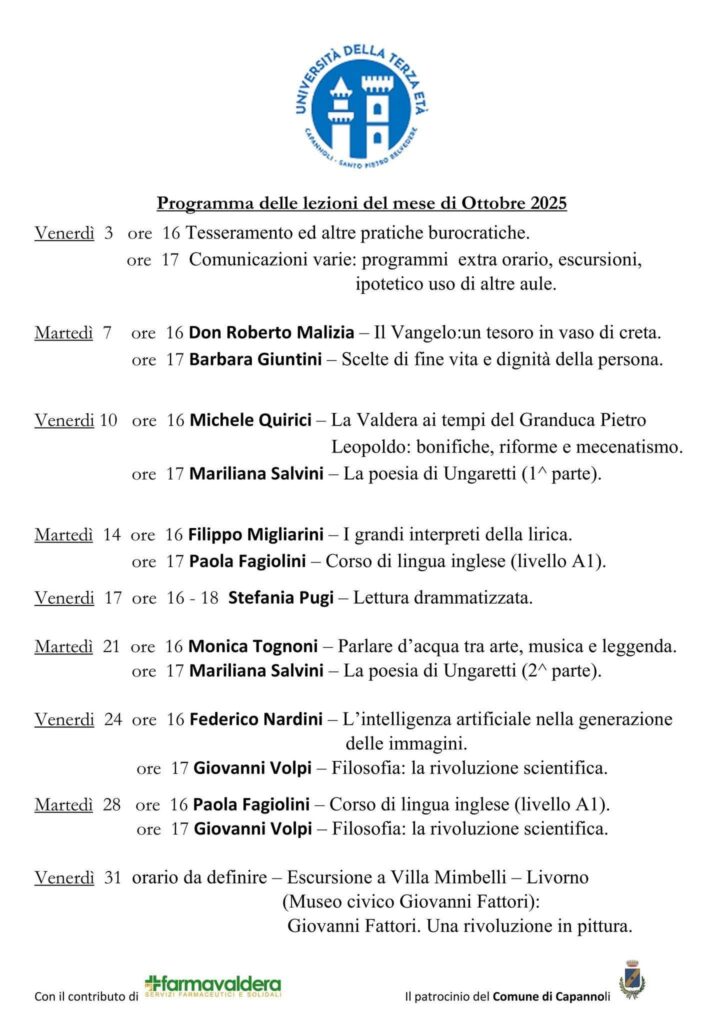 Con l’arrivo di ottobre prende avvio un nuovo anno accademico per l’Università della Terza Età di Capannoli e Santo Pietro Belvedere, che anche quest’anno propone un programma ricco di appuntamenti culturali, formativi e di socialità. Come comunica il Comune di Capannoli alla nostra redazione, le lezioni sono riprese ufficialmente venerdì 3 ottobre e si terranno ogni martedì e venerdì dalle ore 16 alle 18, offrendo alla cittadinanza occasioni preziose di crescita e incontro.