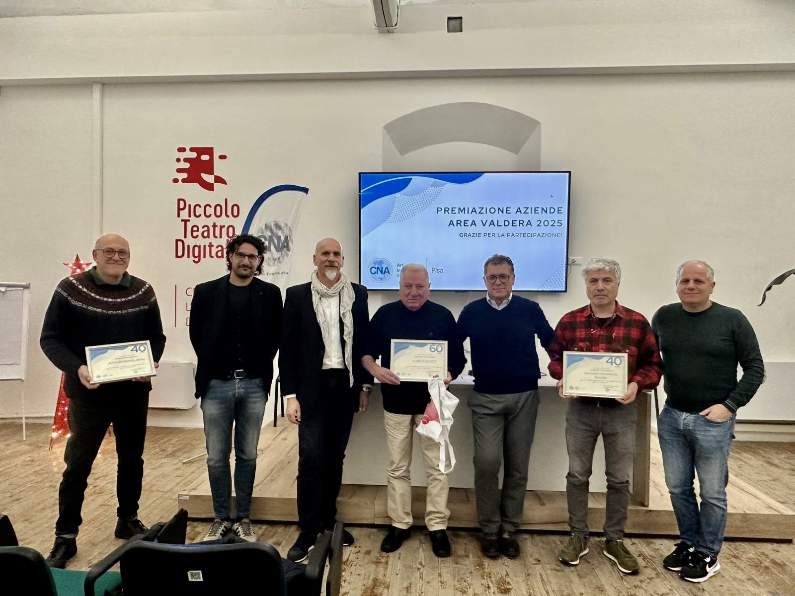 CNA Pisa premia le sue aziende virtuose e longeve. Si è svolta ieri, al Piccolo Teatro Digitale di Pontedera, la cerimona di premiazione di quattro imprese che rappresentano un punto di riferimento storico per la Valdera. Un piccolo gesto simbolico quale riconoscimento per la continuità, la qualità e il contributo umano e sociale offerto al territorio nel corso dei decenni.